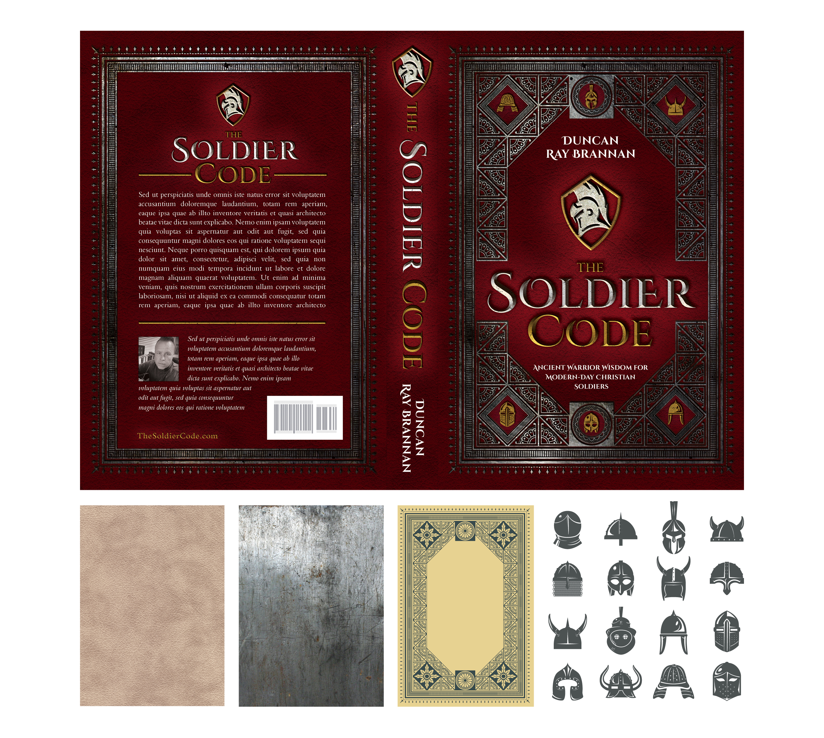 The brief was to create a book cover of an exploration of six ancient warrior cultures (Samurai, Spartan, Viking, Knight, Gladiator, & Legionary), original biblical language, and history that brings powerful insight, wisdom, and weaponry for the Christian’s spiritual warfare. The author wanted three thematic elements in the design: A. Christian spiritual warfare. B. The six warrior cultures (find ways to work imagery which depicts these in your design, whether it comes from stock images of these ancient warriors or more iconic touches like different helmets, weaponry, or shields). C. Rich colouring & texture, the kind that makes a viewer feel like he/she can run fingers over the details, feel the accents, depth, beveling, etc.