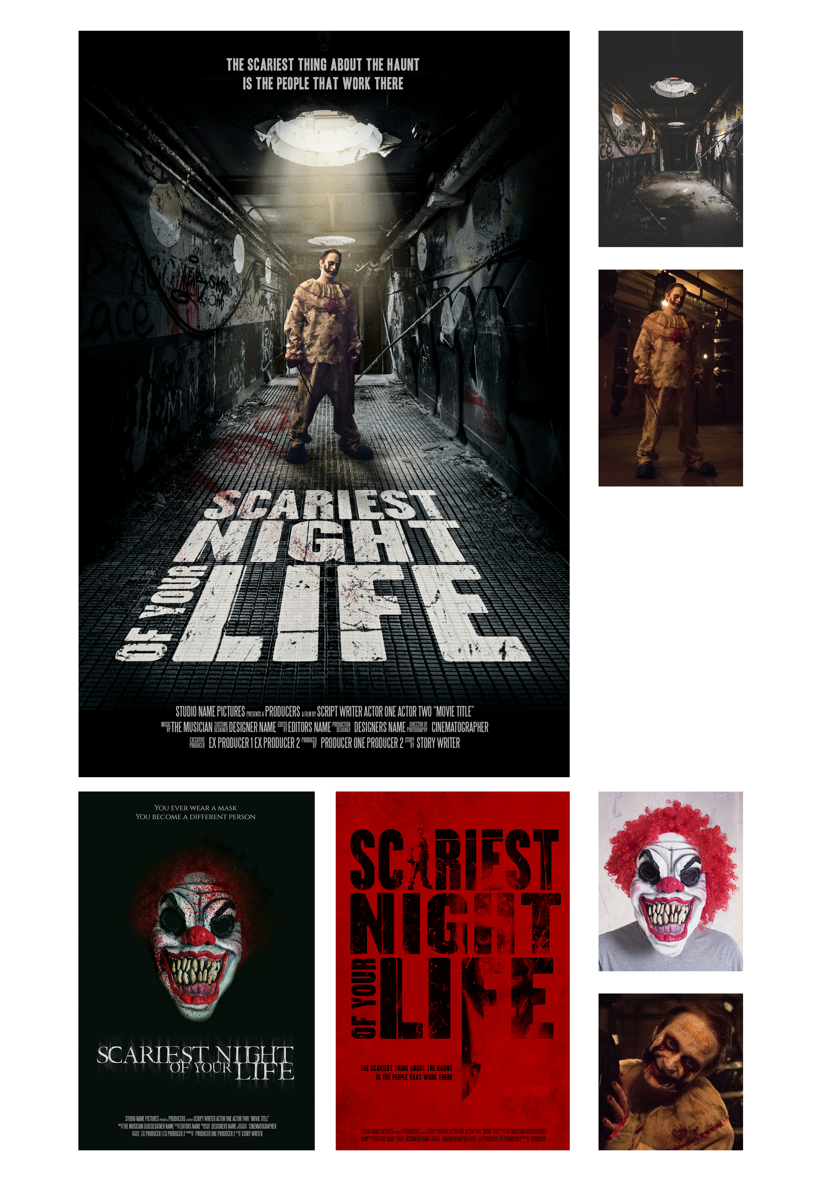 The brief was to create a movie poster for an Independent filmmaker called “Scariest Night of Your Life”. The movie is about 5 college students who visit an isolated Halloween haunt and end up trying to survive the night. The haunt is more an isolated, dilapidated farm in the woods, than amusement park type of haunt which has an underground area with different themed haunt rooms. The movie poster needed to be easily identifiable as a horror movie.